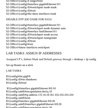 Verify the VLAN and trunk configurations using the appropriate show commands and save the configuration, on both switches, disable DTP only on the access ports